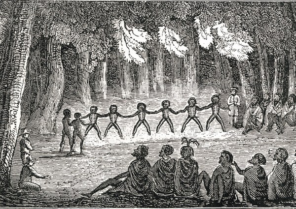 Sketch of a corroboree at Lake George around 1835.