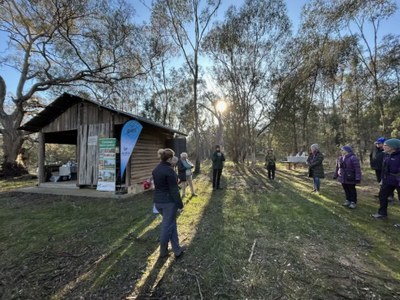 To ensure continued restoration, as well as upkeep of visitor facilities, the Redlands Reserve Conservation Crew was initiated by Local Landcare Coordinator, Claire Birch, commencing in early 2025. Working with two dedicated volunteers, an action plan for the Reserve was developed and included establishing the Conservation Crew monthly working bee. Other actions, largely delivered through the Conservation Crew, have included: general maintenance - such as walking track upkeep, weeding and fence checks, biodiversity and conservation actions - such as species monitoring, modernising the information shelter, designing updated signage, and holding engagement events. The aim for two engagement events at the Reserve during winter of 2025 was met through delivering a successful Breakfast with the Birds session, and a Tracks, Scats and Habitats event for ages 3 to 6 and their families.