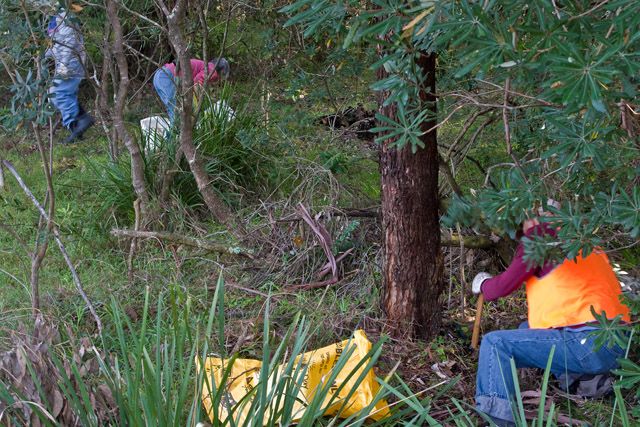 Long Beach Landcare members searching for newly growing asparagus ferns.